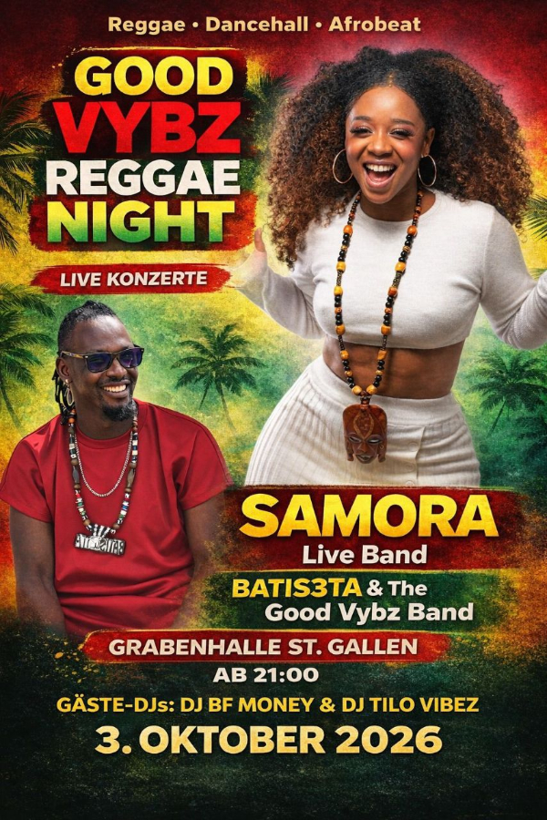 Am 3. Oktober präsentiert Batis3ta gemeinsam mit der Good Vybz Reggae Band eine mitreissende Live-Performance. Die Band besteht aus einer multikulturellen Gruppe talentierter und professioneller Musiker, die mit ihrem authentischen Sound und ihrer starken Bühnenenergie für eine einzigartige Konzertatmosphäre sorgen.