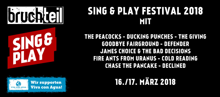 An zwei Tagen teilen sich zehn nationale und internationale Acts die Bühne in der Grabenhalle. Mit dabei sind die Winterthurer “The Peacocks”, welche mit ihrem Mix aus Punk und Rockabilly seit Jahrzenten die weltweiten Locations zum Tanzen bringen. Oder die Engländer von “Ducking Punches”, welche als Toursupport von keinem geringeren als Frank Turner einigen noch bekannt sein dürften. Am Sing & Play Festival Vol. IV geht das Bündnerland mit dem Trio aus “The Giving”, “Declined” und “Chase The Pancake” an den Start. Dazu gesellen sich die Jungs von “Cold Reading”, die Überflieger der Indie-Emo Szene aus Luzern. Die Neuformierung von “James Choice & The Bad Decisions” werden euch an die guten alten Zeiten erinnern, als The Get Up Kids noch die Bühnen beherrschten. “Defender” mussten am Sing & Play Festival 2017 leider krankheitshalber absagen, weshalb sie dieses Jahr wieder ins Line-Up rücken. Abgerundet wird das Festival mit den deutschen Acts “Goodbye Fairground” aus Köln und den “Fire Ants From Uranus” aus Lindau, zwei typischen Punkrock Acts.